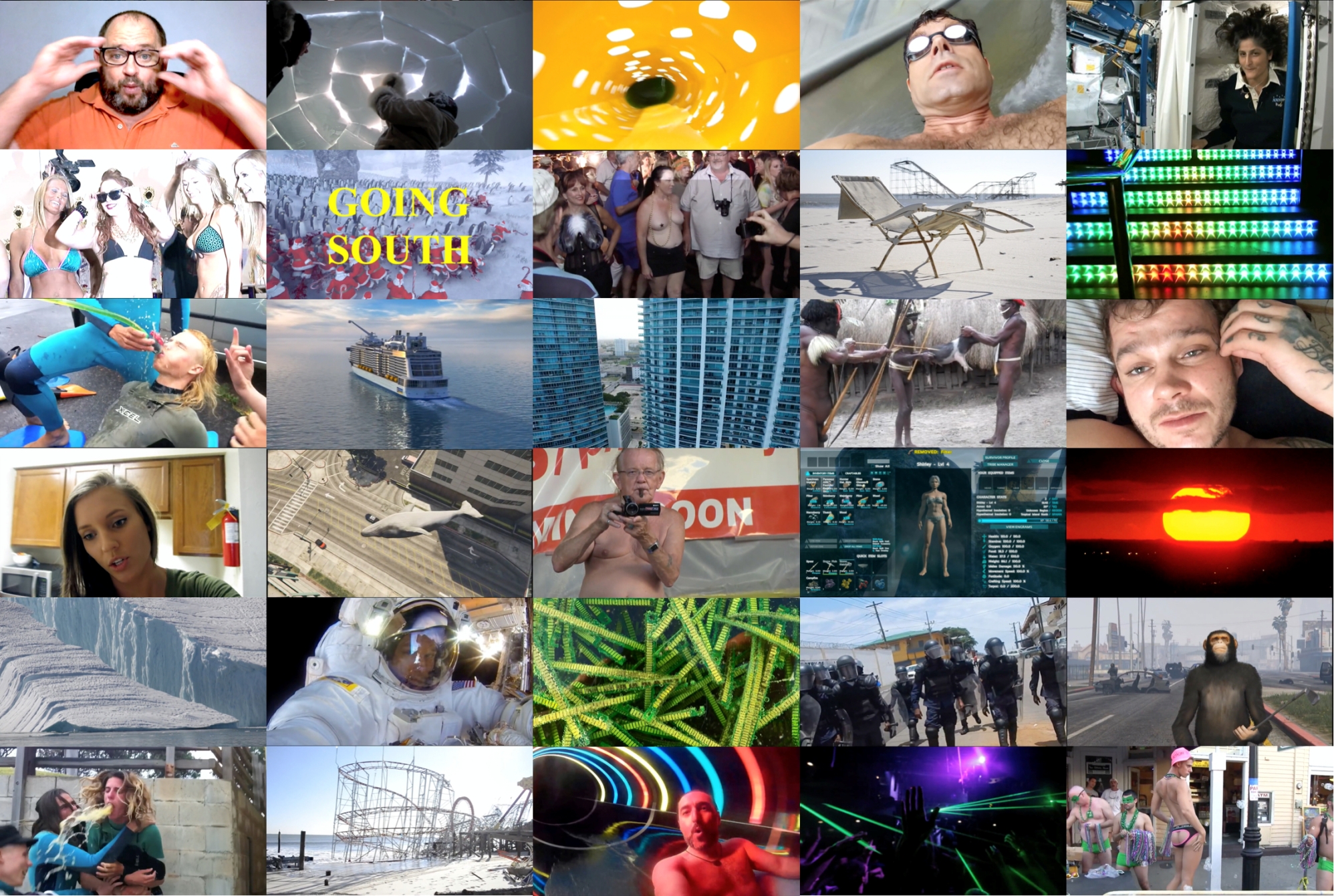 Going South is the second part of a tetralogy in which Dominic Gagnon intends to explore the cardinal points of the Internet in the post-truth era. Faithful to his credo of cinema without camera, he draws the material of his film from the world of YouTubers. Playing along with the absurd Flat Earth theory professed by contemporary gurus, he throws himself into a journey from the polar centre of the disc-shaped Earth towards the Tropics, the cold waters strewn with glaciers, and beyond, to space! Those who he meets share their truth with us in a frenzied mosaic that features on an equal footing shopping lists, intimate outpourings and conspiracy theories, vertiginous images of the earth seen from a space station, innocent holiday films, sexual tourism and tropical cataclysms brought by climate change—a mesmerising echo chamber in which everything is connected. Because everything is true on the Internet. In reverse to journalistic fact-checking, the work of the filmmaker is then to construct, from his own subjectivity, an idea of the South, in the same way that of the North worked with an idea of the North. Visions du Réel